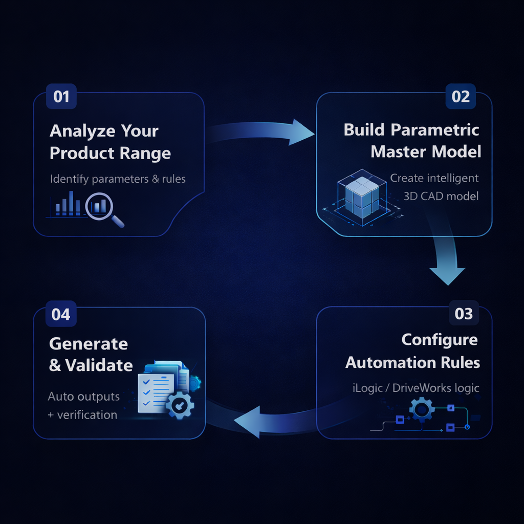 We take your existing product family, build a parametric master model, and embed intelligent design rules - so every new variant is generated automatically.